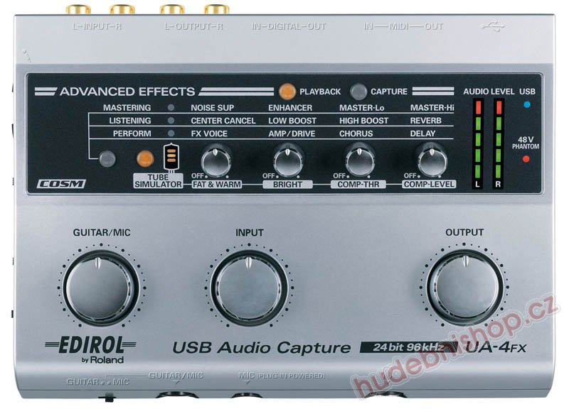 Série audio rozhraní UA od společnosti Edirol patří už léta k celosvětově nejprodávanějším výrobkům a fanouškům počítačového nahrávání se tato zařízení skvěle vyplatila. Dnes EDIROL posouvá pomyslnou laťku poměru cena/výkon opět výš novým rozhraním UA-4FX. Toto přenosné USB audio/MIDI rozhraní vytváří nový standard pro cenově dostupná zařízení svým ultra rychlým, nízkolatenčním audio & MIDI výkonem, 24/96 audio rozlišením a vestavěnými efekty — včetně simulátoru lampového mikrofonního předzesilovače s technologií COSM® pro proteplení vašich nahrávek. UA-4FX se dodává s nahrávacím software SONAR LE od společnosti Cakewalk a zásuvným modulem (pluginem) EDIROL Virtual Sound Canvas (pro počítače třídy PC), což z něj činí skutečné řešení vašeho nahrávání „v jednom balíku“ za neuvěřitelně nízkou cenu.